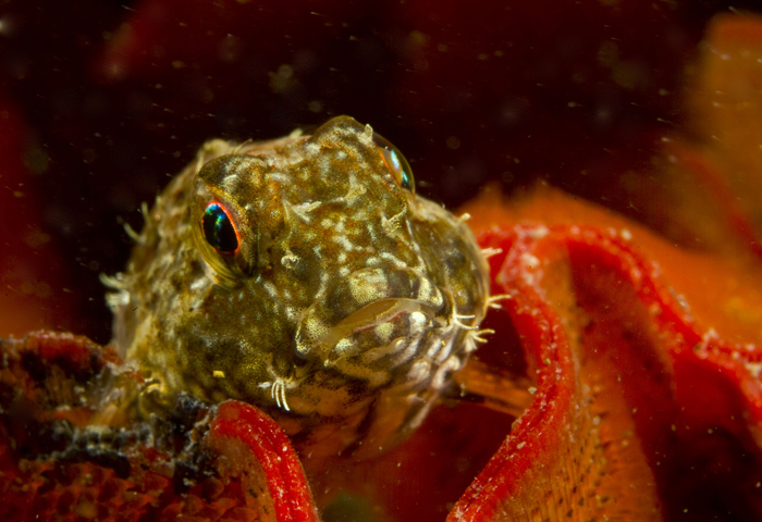 Fringeheads are, without doubt, the stars of the fish world under the piers. But they won't win any beauty contests. The prettiest of the little benthic fishes in that complex ecosystem is, IMHO, the sculpin. One day I was looking for subjects in a mass of red bryozoan near the bottom of a piling, when I looked up and saw this little face looking down at me. He remained long enough to endure several strobe flashes. We have used this image many times, including on the covers of our two Morro Bay books. This is a snubnose sculpin (Orthonopias triacis), one of about a half-dozen sculpin species we have found in Morro Bay. In this image you can actually see his lower row of little teeth. They have such beautiful eyes! |